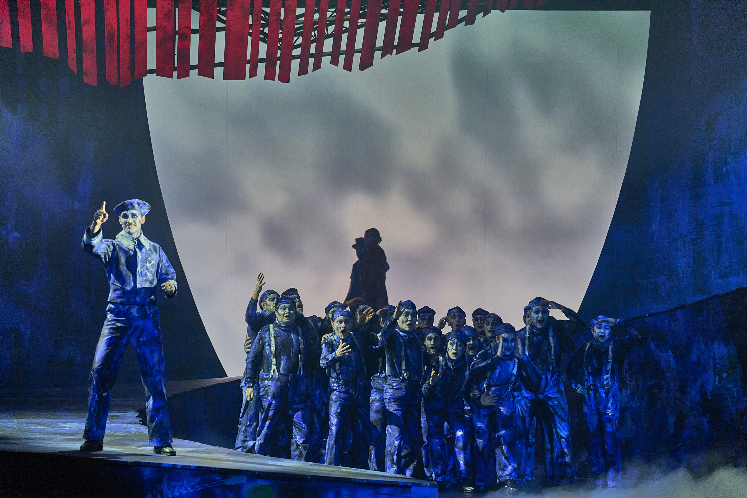 Krauß liest den „Fliegenden Holländer“ als romantische Horrorstory. Der Holländer, von Martin-Jan Nijhof mit intensiver Präsenz und großartiger Stimme gestaltet, erscheint wie ein Untoter: blasses Gesicht, rot umrandete Augen, ein Körper, gezeichnet von Jahren auf dem Meer. Sein blutrotes Kostüm kontrastiert scharf mit dem tiefblauen Ensemble – Sinnbild seines ewigen Fluchs.