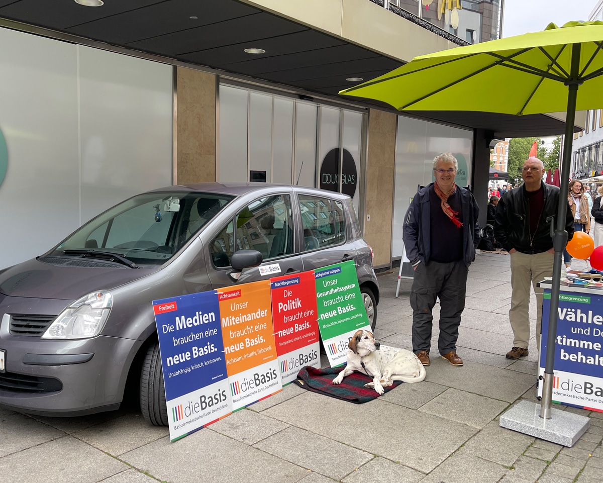 Keine 300 Meter von den wild parkenden Genossen nahm sich am Samstagvormittag die aus dem Umfeld der Corona-Skeptiker gegründete Partei „die Basis“ das Parkverhalten der Sozialdemokraten zum Vorbild und stellte ein ebenfalls mit einem Parteiaufkleber versehenes Auto vor das Geschäftshaus Ecke Nikolaiort / Große Straße.