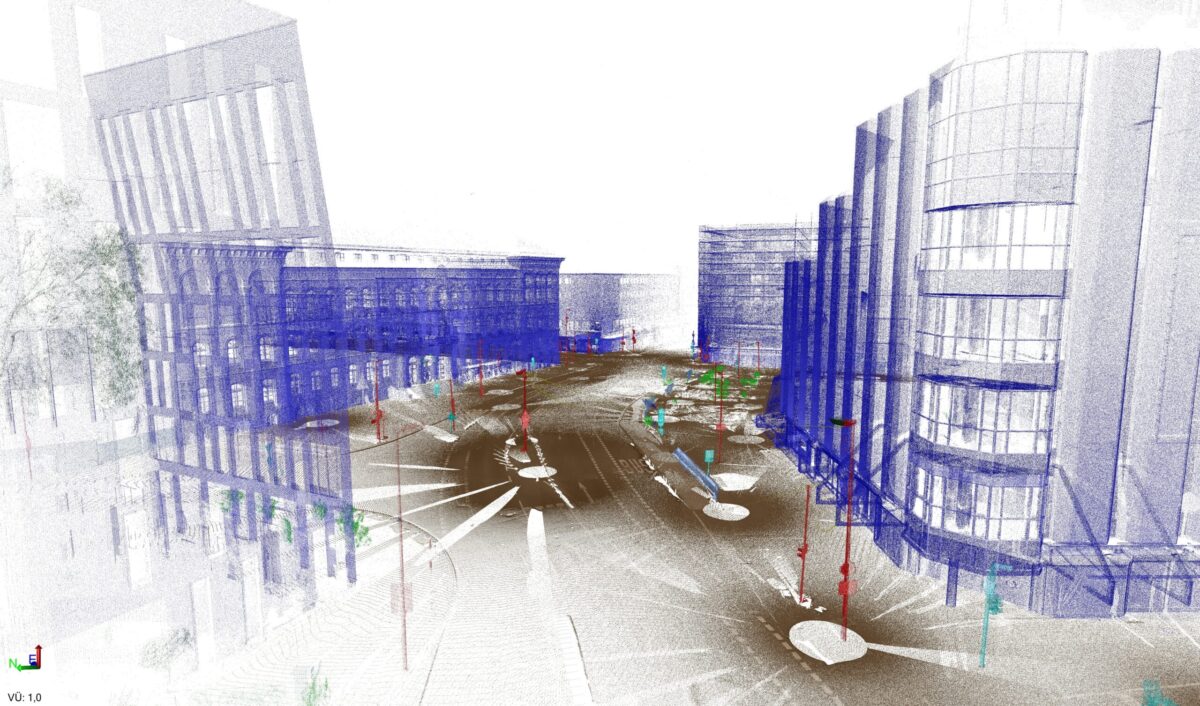 Dabei geht es nicht nur um die Verkehrsflächen. Auch die anliegenden Gebäude werden erfasst – millimetergenau und dreidimensional. Bei dieser Bestandsaufnahme entsteht eine sogenannte Punktwolke. Jedes sichtbare Element wird im Abstand von rund einem halben Zentimeter erfasst und als Punkt dargestellt. Die Summe dieser Punkte ergibt dann ein hochpräzises Bild der Umgebung. Was aufwendig und langwierig klingt, geht verhältnismäßig schnell. Denn innerhalb von nur zwei Minuten können die verwendeten Spezialgeräte rund elf Millionen dieser Punkte erfassen und speichern. Für den Bereich zwischen der Brücke über die Hase (Öwer de Hase) und dem Neuen Graben werden schätzungsweise eine halbe Milliarde dieser Punkte zusammenkommen und ein umfassendes 3D-Bild ergeben. Doch diese sogenannte terrestrische Laserscanaufnahme ist noch nicht alles. Auch aus der Luft kommt ein Laser zum Einsatz, genauer gesagt ein LIDAR-Lasersensor, der an einer Drohne befestigt ist und den Bereich detailliert von oben erfasst. Dabei darf auch die Erstellung eines klassischen Luftbildes nicht fehlen.