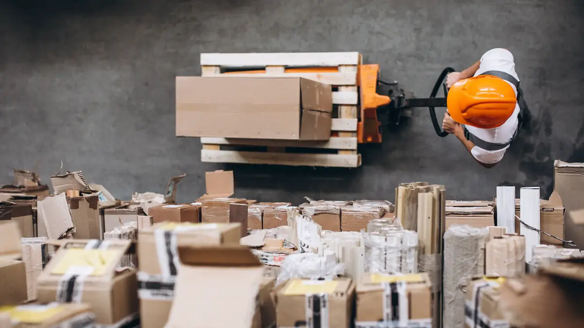 Lagerarbeiter mit einer Palette auf einem Hubwagen