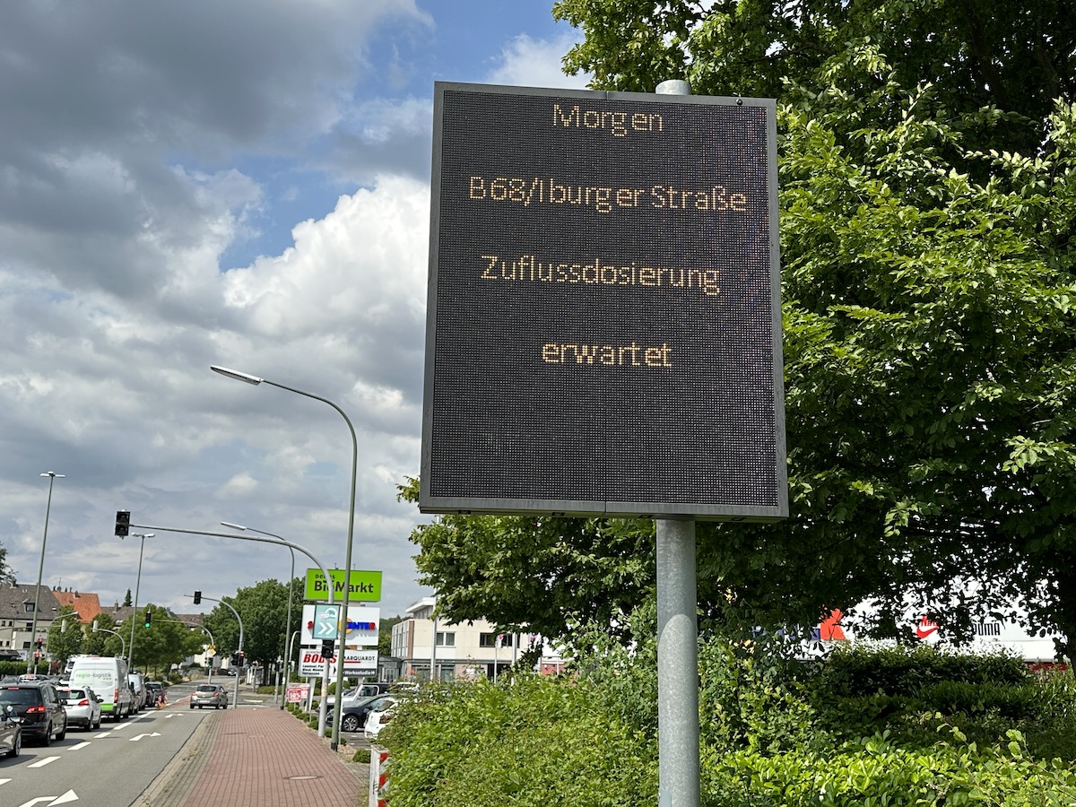 Mit dem, was auf dem Schild angezeigt wird und was bei den folgenden Ampeln dann für angepasste Rotphasen sorgt, soll der „Zufluss“ von zusätzlichem Verkehr in die Innenstadt von Osnabrück ab Juli bereits an der Stadtgrenze „dosiert“ werden.