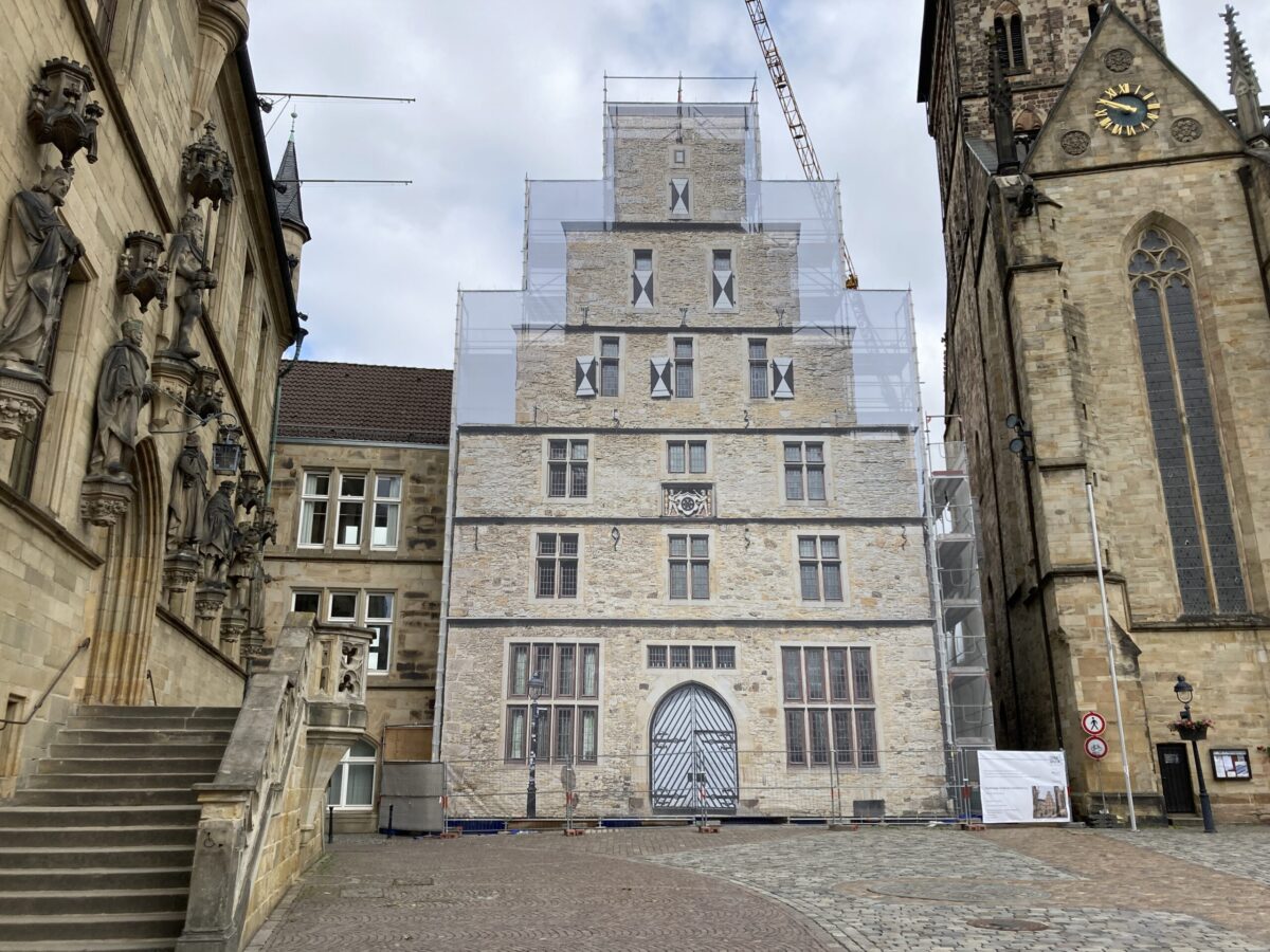Die Stadtwaage, eines der prägnantesten Gebäude am historischen Marktplatz Osnabrücks, wird derzeit aufwendig saniert – und das für stolze 7,5 Millionen Euro. Damit das markante Bauwerk aus dem Jahr 1532 während der Bauphase nicht völlig aus dem Stadtbild verschwindet, wurde das Netz vor dem Gerüst bereits im vergangenen Monat an der Marktseite mit einem großflächigen Druck des Gebäudes versehen.