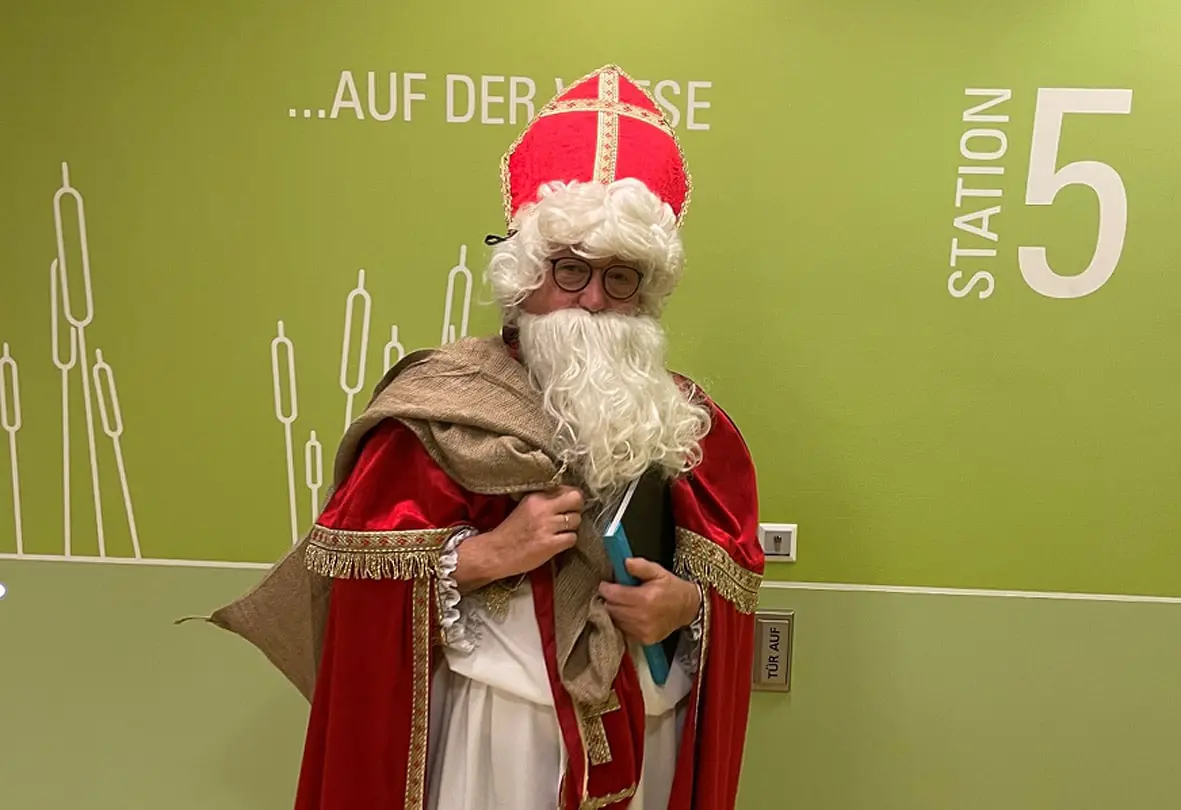 Matthias Wachau, evangelischer Krankenhausseelsorger am Christlichen Kinderhospital Osnabrück, hat als Nikolaus von Myra verkleidet, kranke Kinder auf den Stationen besucht. /Foto: Christlichen Kinderhospital Osnabrück