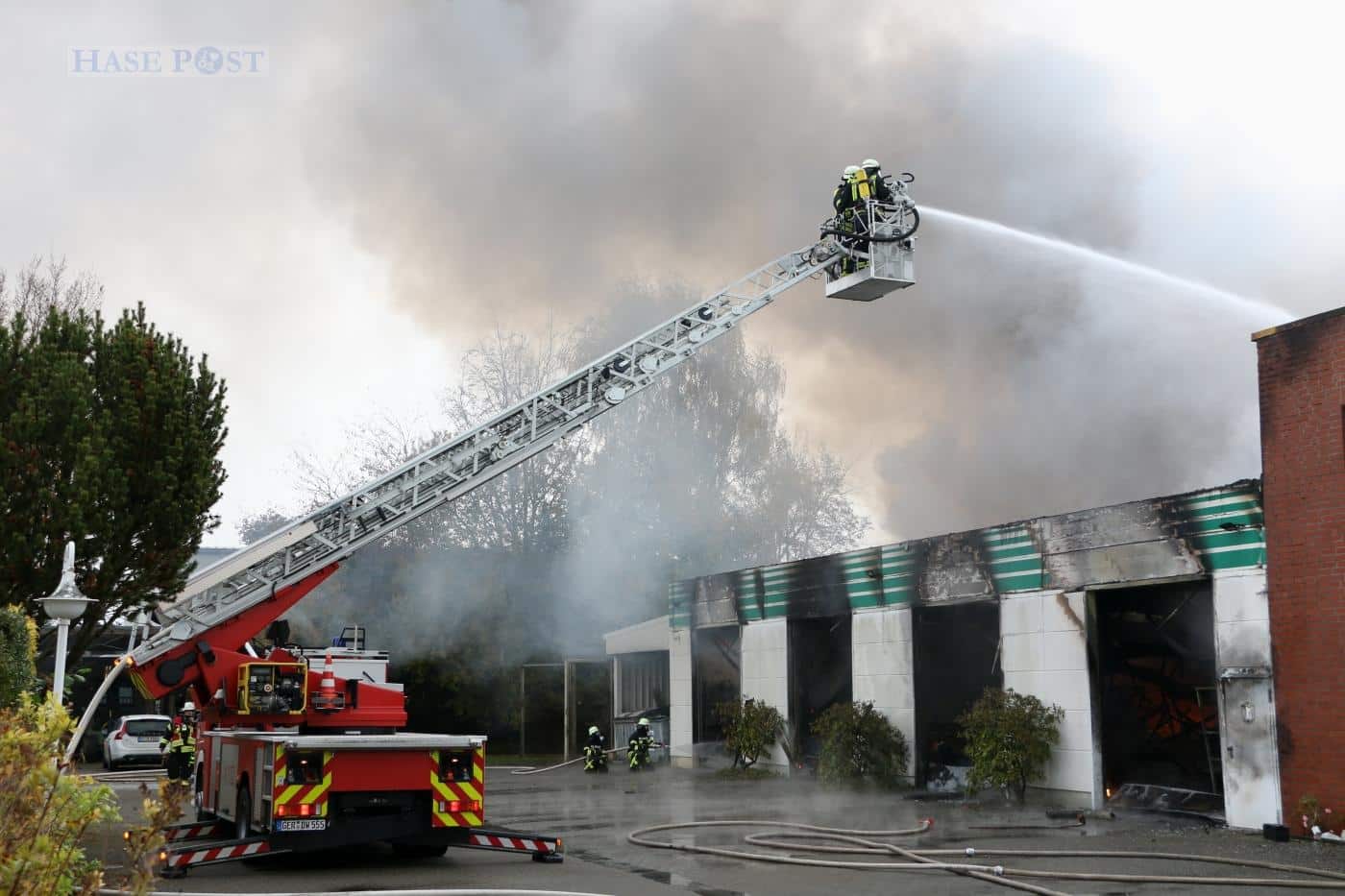 „Aufgrund der Brandintensität war klar, dass die Halle verloren ist.“ erläuterte uns Nils Hoyermann, Pressesprecher der Freiwilligen Feuerwehr Melle. „Wir setzten daher zunächst den Schwerpunkt, eine Ausbreitung auf das angrenzende Bürogebäude mit einer Wohnung sowie ein benachbartes Wohnhaus zu verhindern“, so Hoyermann weiter.