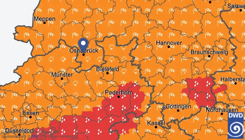 Am späten Nachmittag kam zusätzlich noch ein Gewitter hinzu, das Osnabrück mit schweren Sturmböen mit Geschwindigkeiten um 100 km/h (28 m/s, 55 kn, Bft 10) traf, so die amtliche Warnung des DWD vor dem Gewitter.