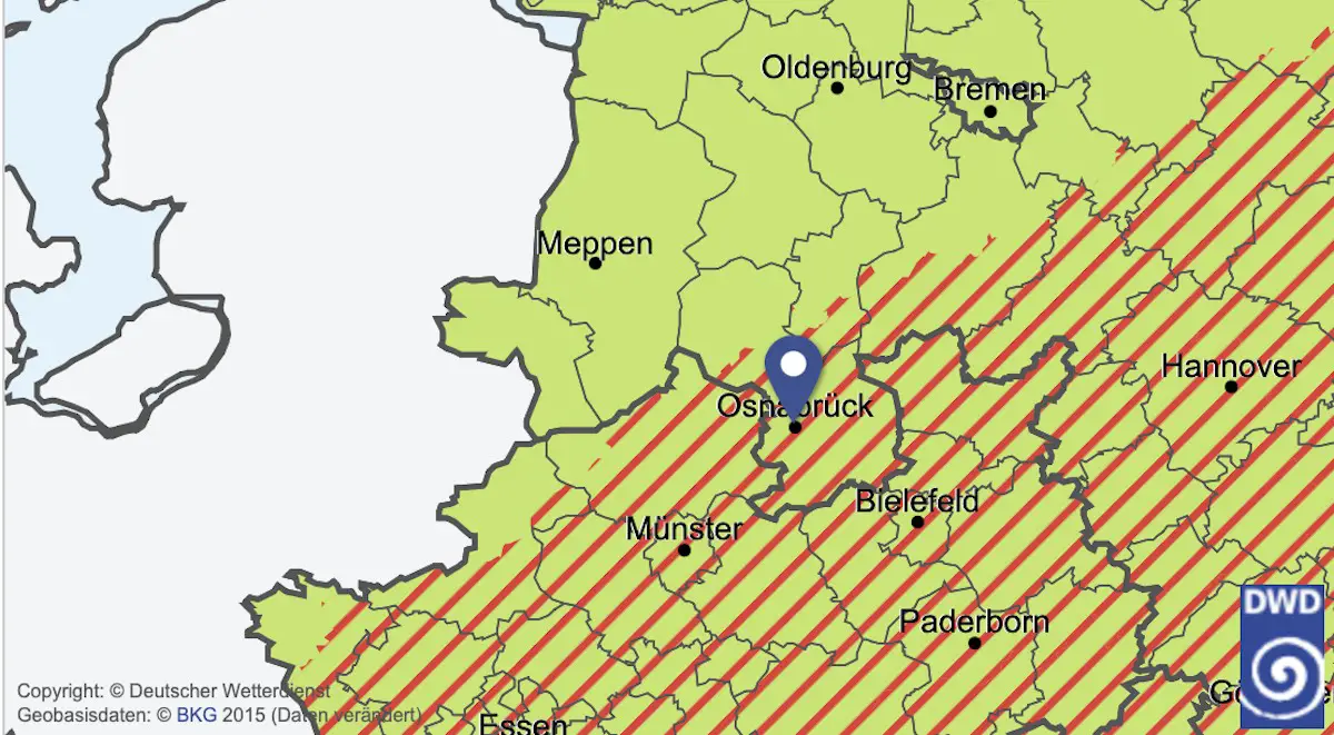 Der Deutsche Wetterdienst (DWD) hat eine Warnmeldung für die Region Osnabrück veröffentlicht.