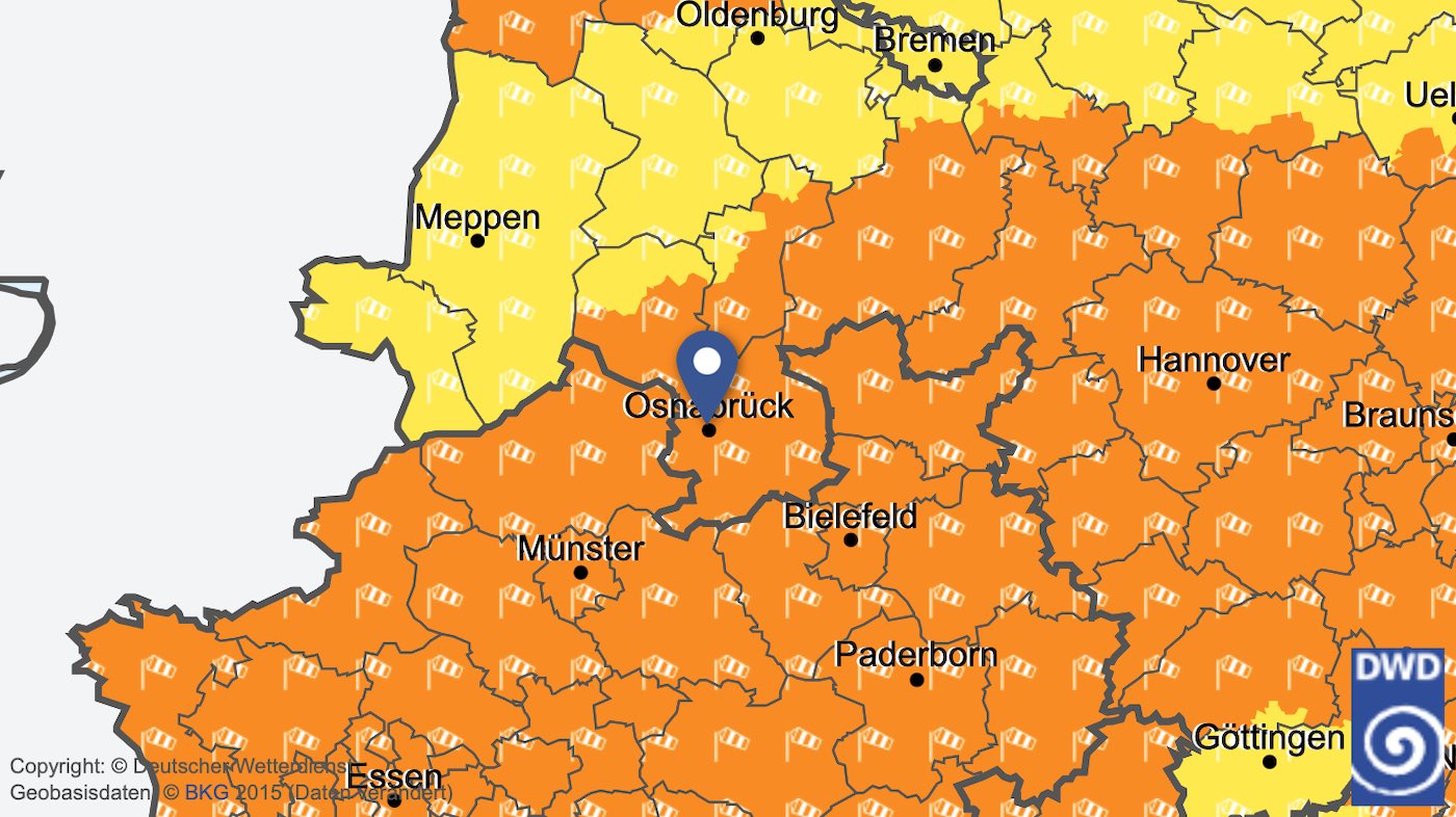 Der Deutsche Wetterdienst (DWD) hat für Dienstag, den 14.11.2023, eine amtliche Warnung vor Sturmböen für Stadt und Landkreis Osnabrück veröffentlicht.