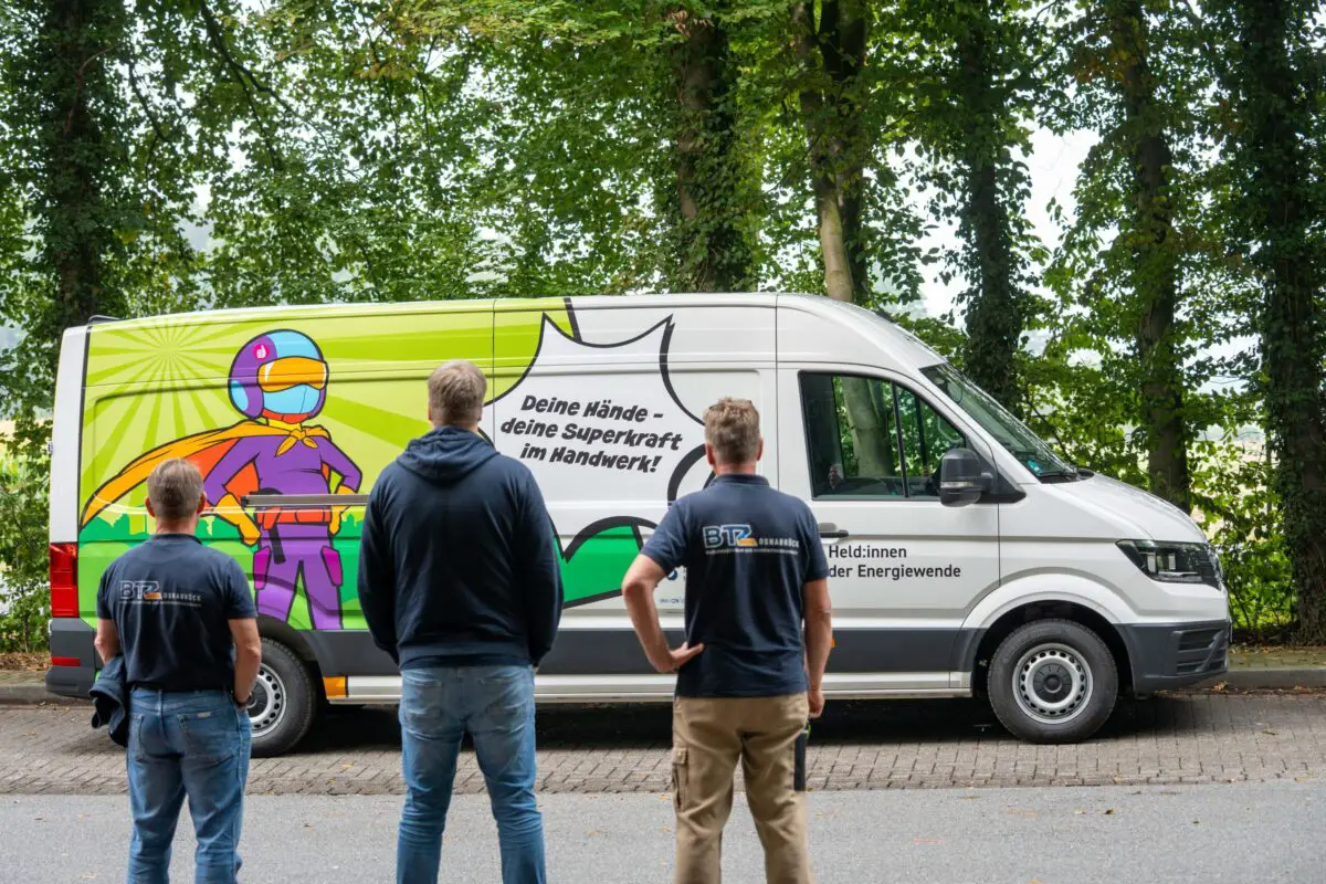 Wenn Peter Ostendorf und Uwe Klenke morgens in ihre auffällig gestalteten Transporter steigen, fällt manch ein Blick auf die bunte Superhelden-Optik der Fahrzeuge. Die beiden Lehrwerkmeister der Handwerkskammer Osnabrück sind unterwegs zu einer weiterführenden Schule im Stadtgebiet beladen mit Werkbänken, Werkzeug und Materialien. Vor Ort verwandelt sich der Schulhof innerhalb weniger Minuten in eine mobile Werkstatt. Schülerinnen und Schüler der zehnten Klassen erhalten hier praxisnahe Einblicke in Bau-, Ausbau- und Versorgungstechnik – und dürfen auch selbst Hand anlegen.