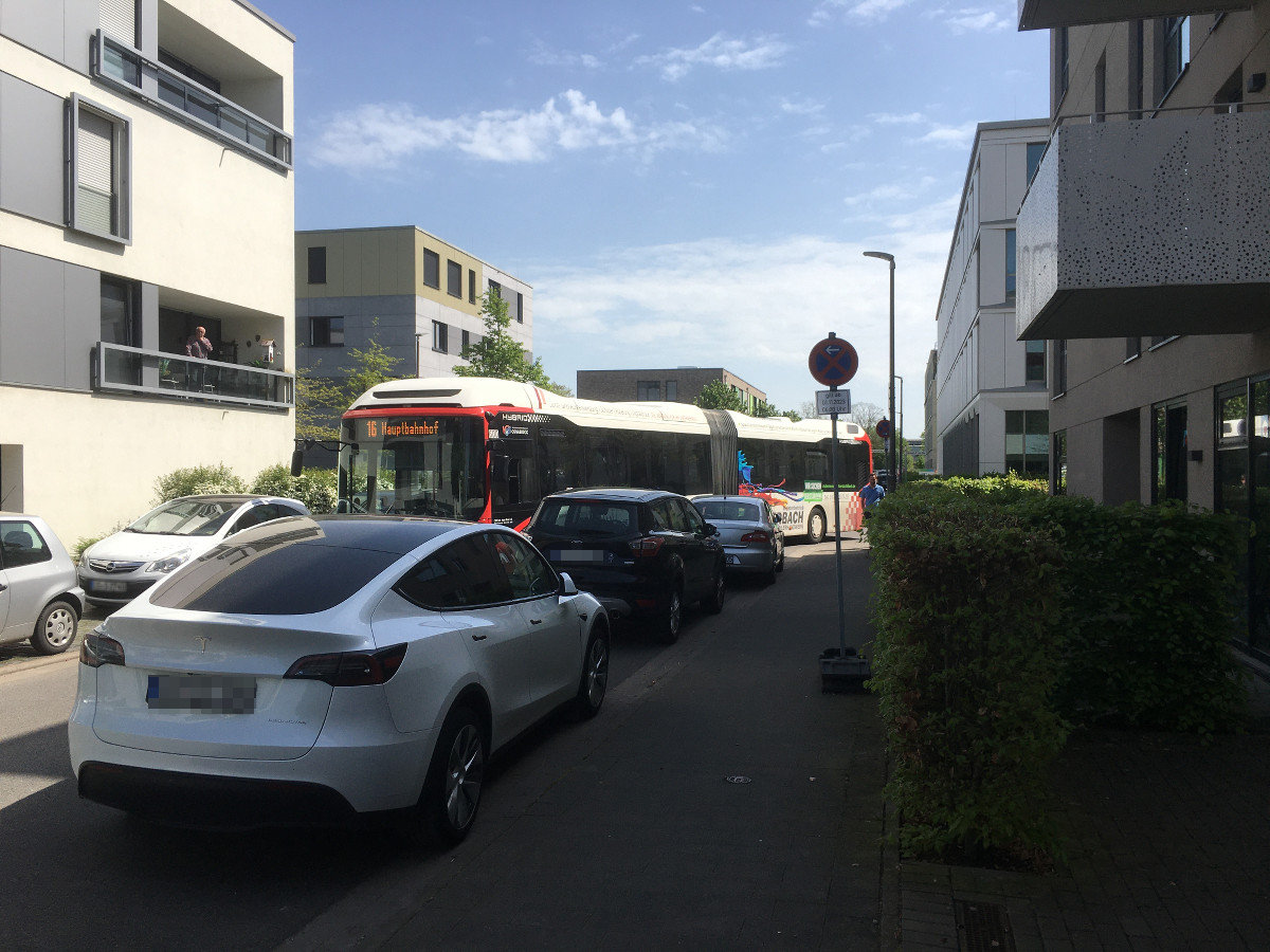 Am Dienstagmittag (30.04.) blockierten gleich zwei Autos die Schleppkurve im absoluten Halteverbot, was dazu führte, dass die Busse zwischen 12:30 und 13:20 Uhr nicht weiterkamen. Bis die Fahrer ihre Autos entfernten, waren 50 Minuten verstrichen und insgesamt vier Busse stauten sich bis in die Ursula-Flick-Straße. Die Albert-Einstein-Straße war in der Zeit auch für Autos und Fahrräder vollständig blockiert. Nachdem sich die beiden Falschparker, denen ein Bußgeld in Höhe von 70 Euro droht, entfernt hatten, dauerte es nur rund eine halbe Stunde, bis das nächste Auto an derselben Stelle im absoluten Halteverbot abgestellt wurde.