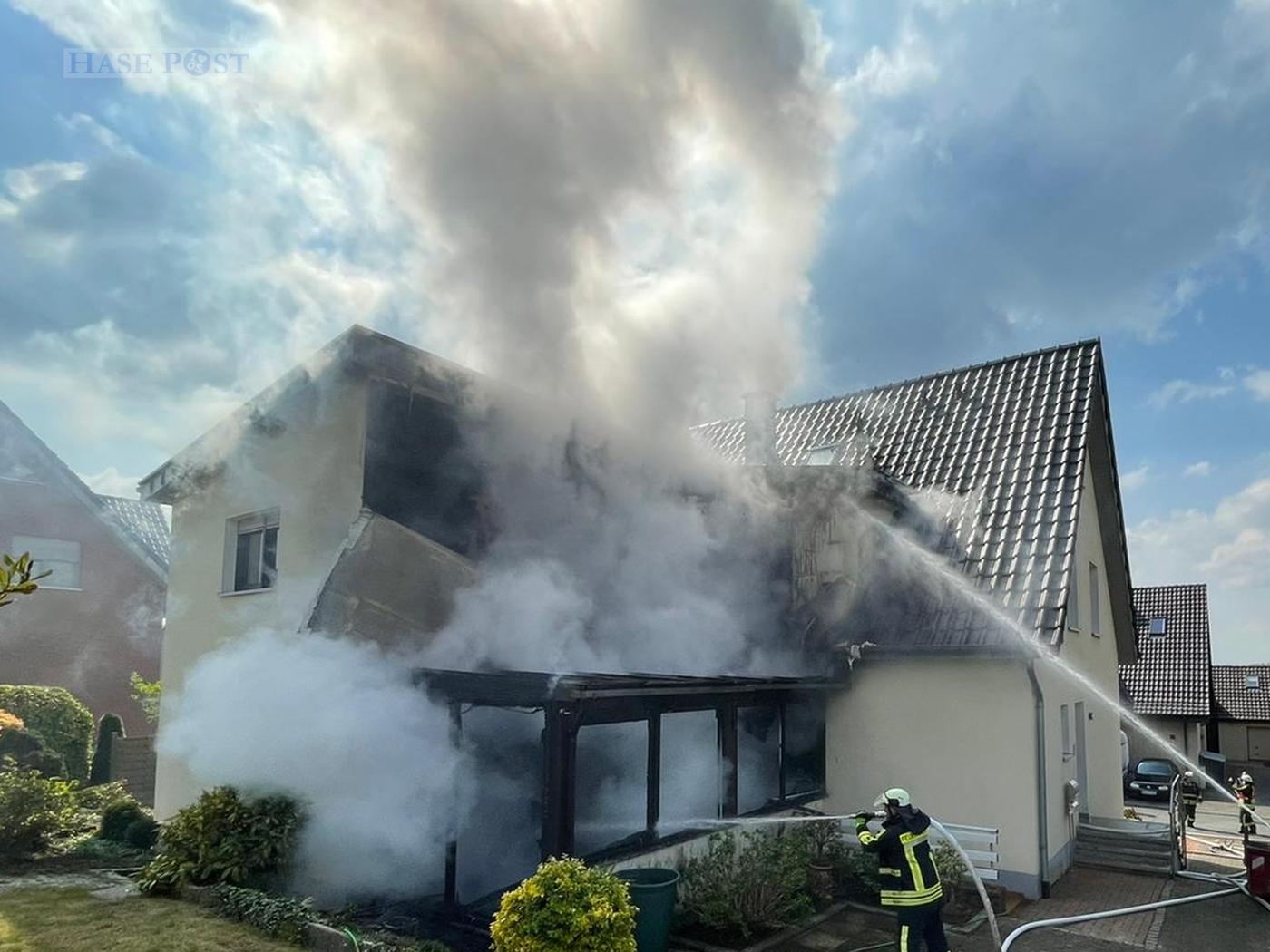 Nach einem lauten Knall wurden am Dienstagnachmittag (26.04.2022) zahlreiche Einsatzkräfte mit dem Stichwort Einsturz/Explosion in ein Wohngebiet in Hagen im Landkreis Osnabrück gerufen. Vor Ort brannte ein Wintergarten an einem Wohnhaus. Eine Person wurde verletzt.