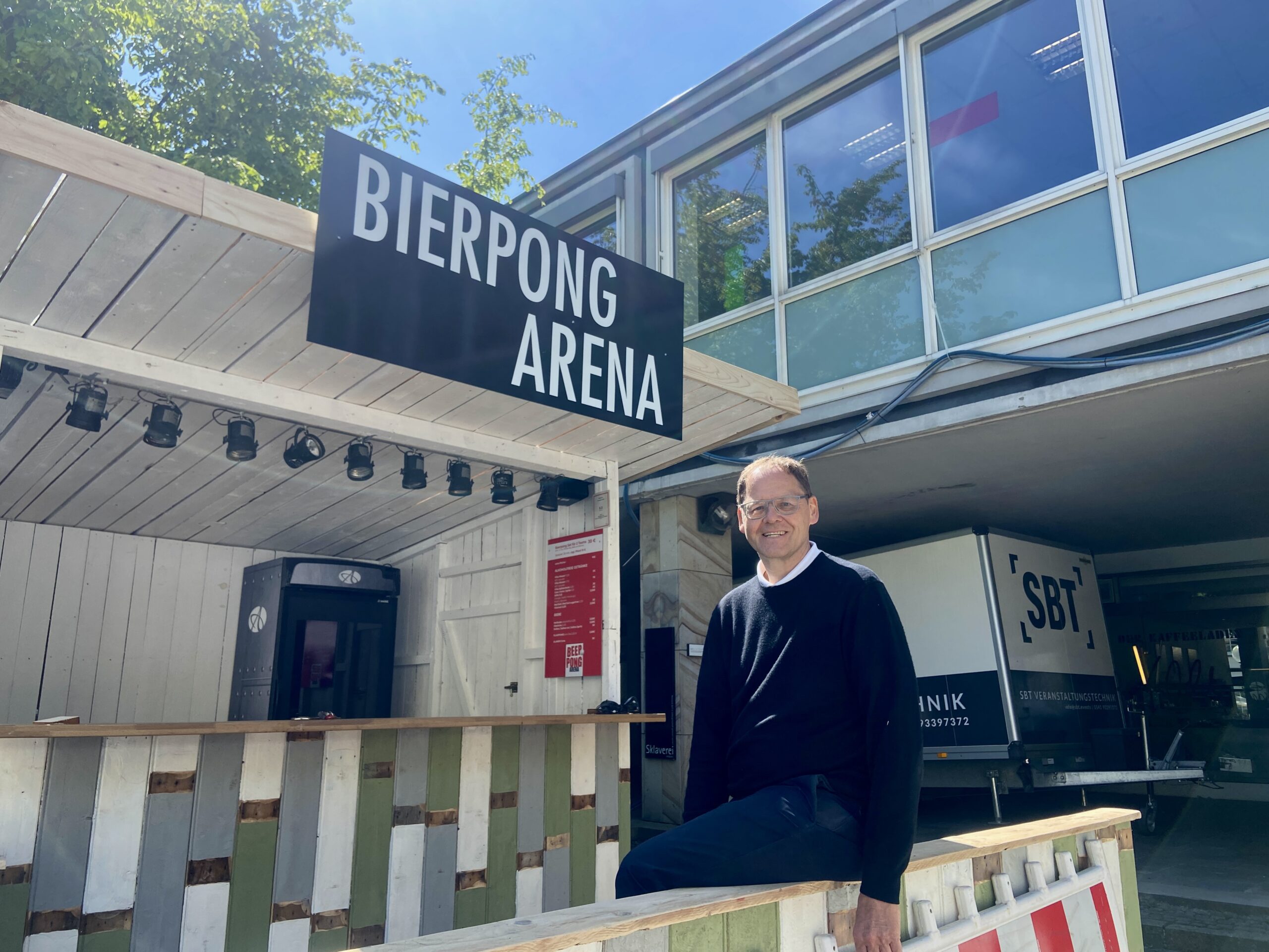 In diesem Jahr betreibt das Alando wieder die an den Marktplatz angrenzende Fläche bei der Stadtbibliothek. An das Maidorf erinnert das neue Konzept von Frederik Heede jedoch nicht, das gibt es ja auch weiterhin im Alando Ballhaus. Stattdessen bietet er zweierlei: Einerseits entsteht ein Weingarten, in dem zahlreiche Sitzplätze zur Verfügung stehen und außerdem Möglichkeit für Beer-Pong-Partien. „Es gibt wenige Orte auf der Maiwoche, die Sitzplätze und wenig Gedränge bieten. Genau das soll der Weingarten bieten“, erklärt Heede. Beer-Pong sei bei Studierenden angesagt und ergänze damit das Angebot für die jüngere Generation auf der Maiwoche.