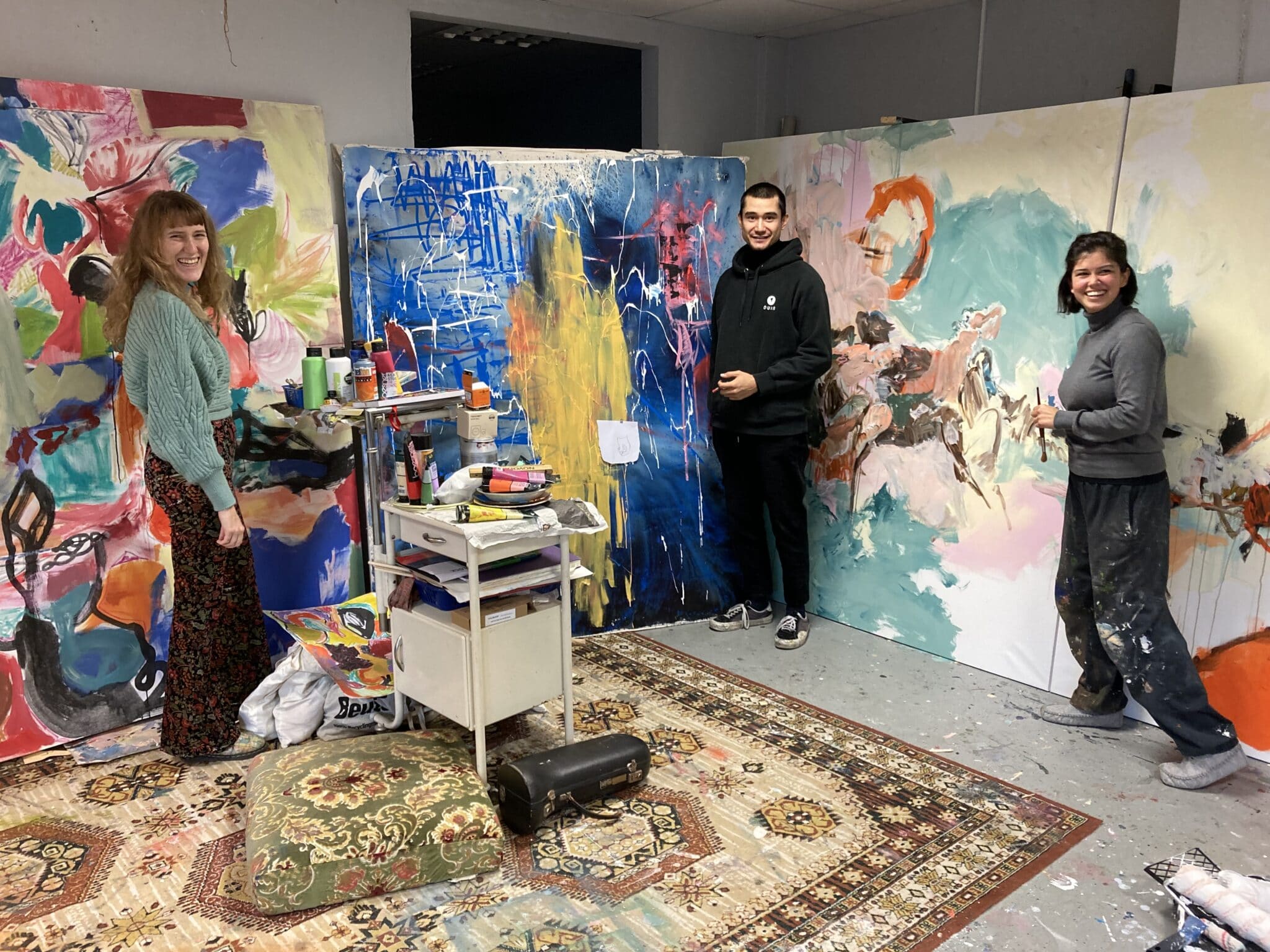 v.l. Melanie Harder, Azim Becker und Elena Kok arbeiten im Atelierhaus an ihren Werken. Foto: Sophie Scherler