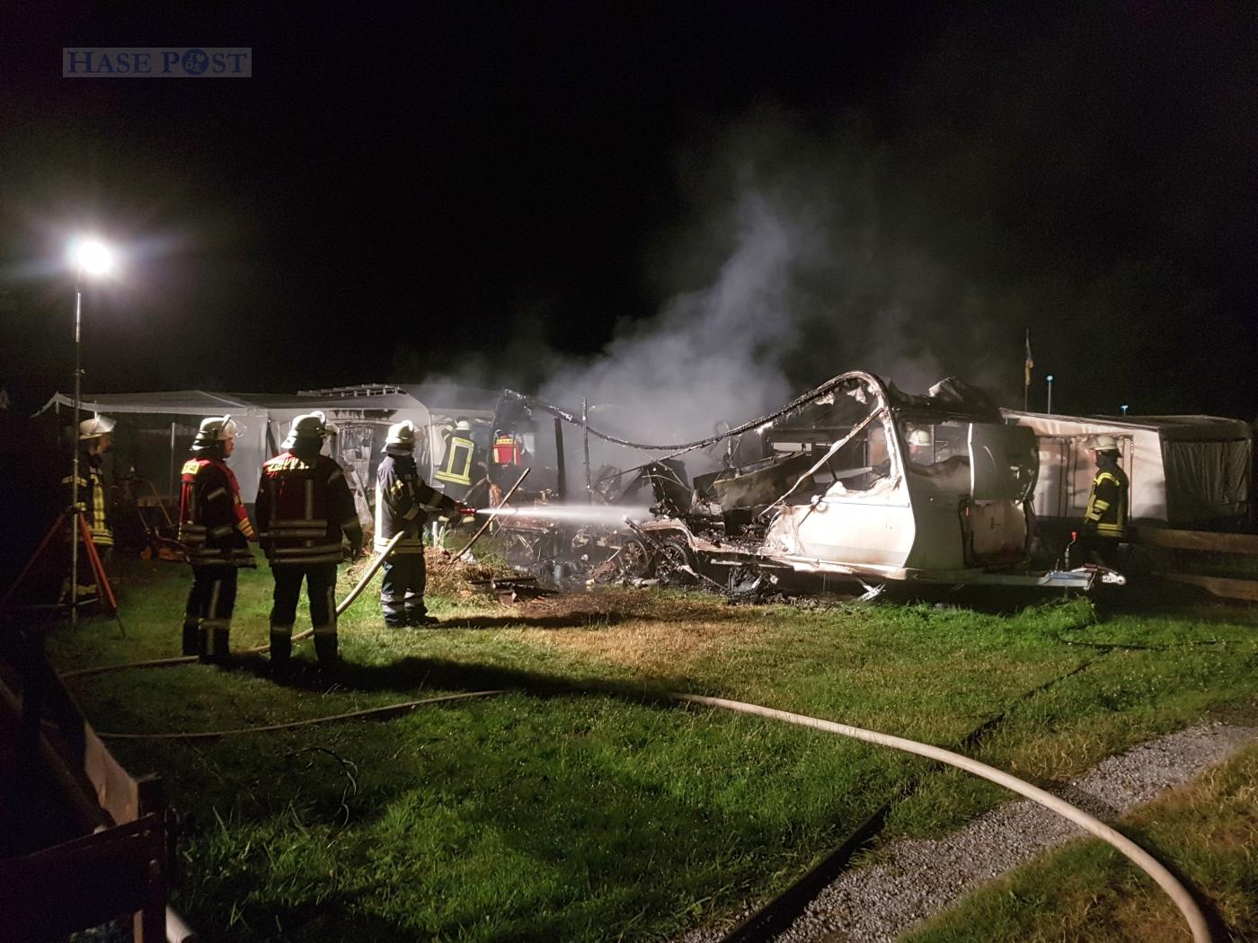 Wohnwagen brennt auf Meller Campingplatz ab, betrunkene Gaffer greifen Polizei an