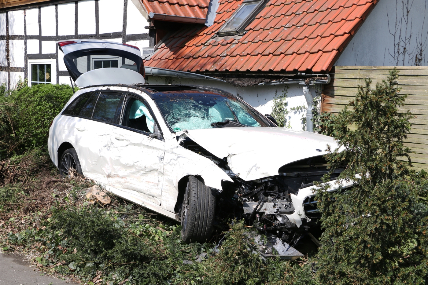 Der Mercedes versuchte noch auszuweichen, dennoch kam es zum Zusammenstoß beider Fahrzeuge. Dadurch schleuderte er über die Gegenfahrbahn in den Vorgarten eines Wohnhauses und kam auf der Seite zum Liegen. Die Erstmeldung bestätigte sich vor Ort aber nicht, die Insassen wurden nicht eingeklemmt.