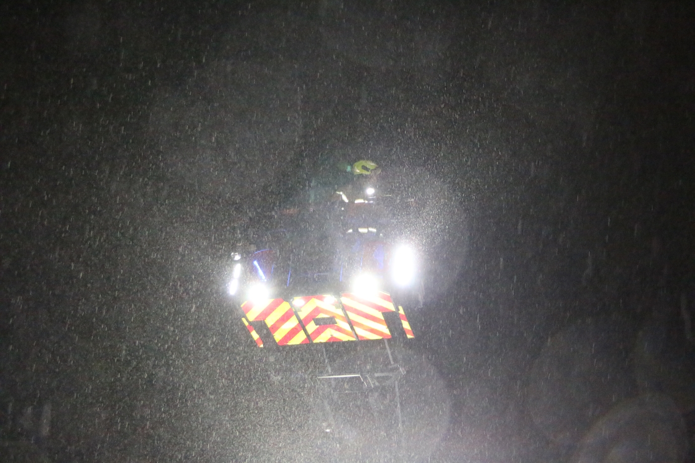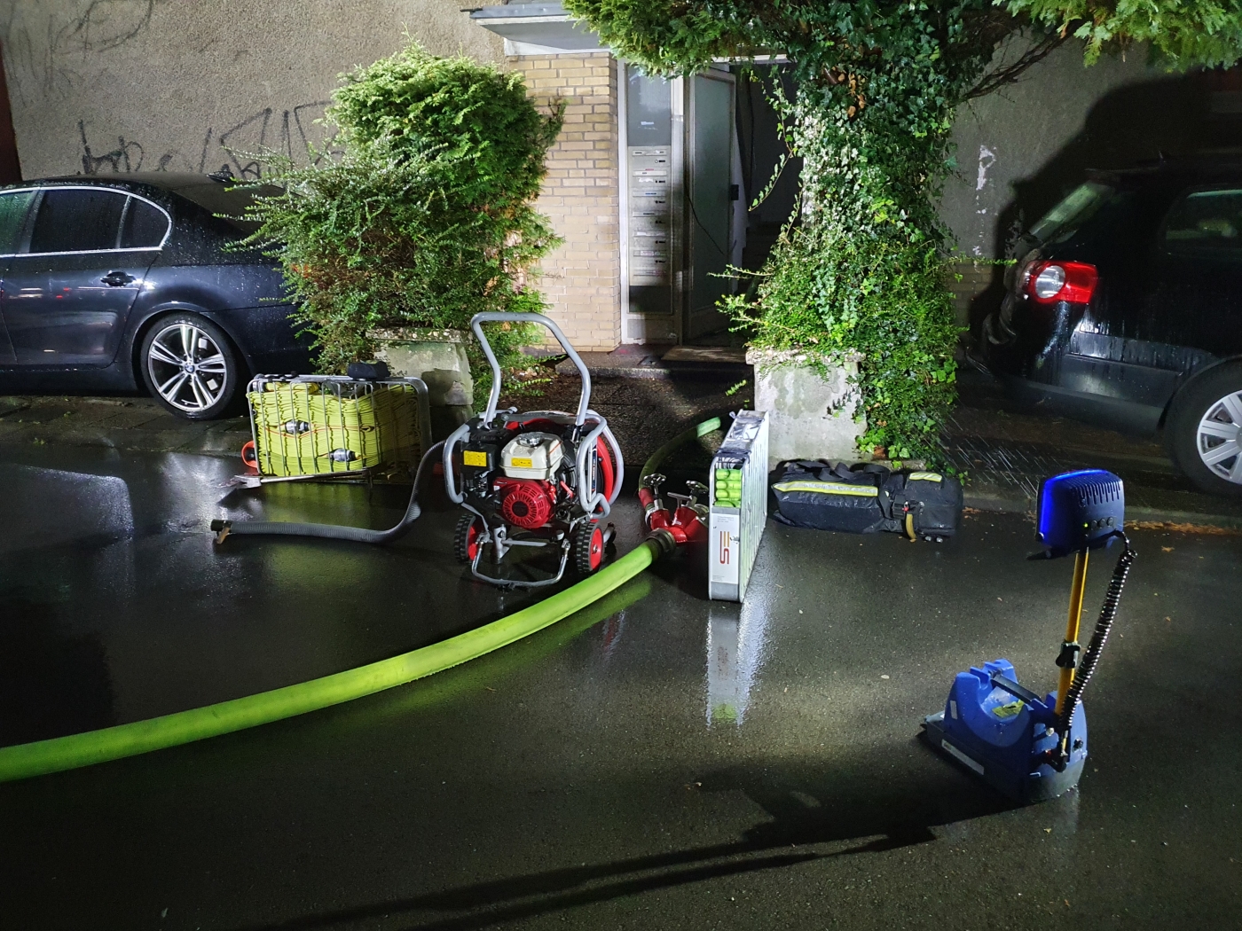Der Treppenraum wurde mit einem Hochleistungslüfter entraucht, um ein Eindringen von Brandgasen in die Wohnungen zu verhindern und die Menschen zu schützen, die sich darin aufhielten. So konnte ein Evakuierung im strömenden Regen vermieden werden. Parallel, fand ein Einsatztrupp unter schwerem Atemschutz das Feuer in einer Wohnung im ersten Obergeschoss.