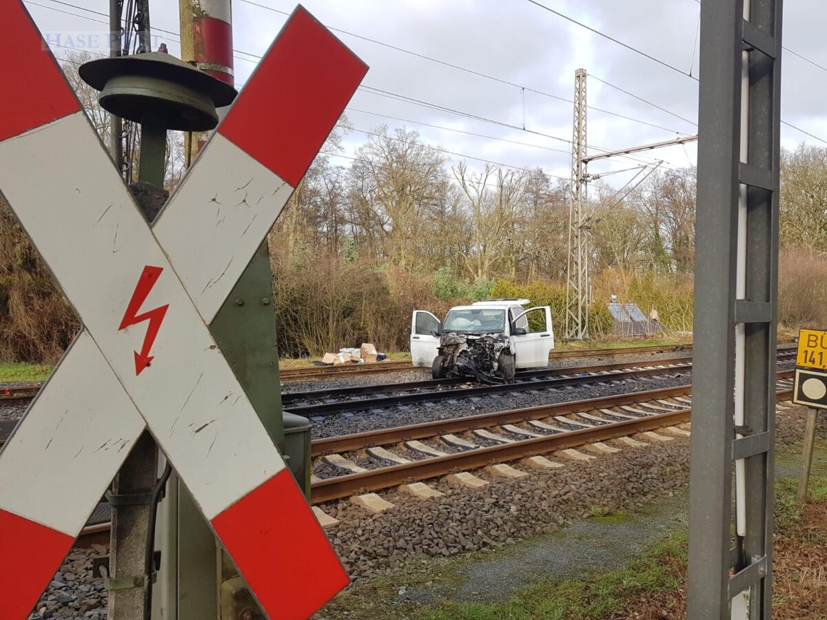 An einem Bahnübergang in Atter hat am Freitagmittag (28. Januar 2022) ein Zug einen Pkw erfasst. Großes Glück hatte der Fahrer des Pkw, der nur leicht verletzt wurde. Auf der Zugstrecke Osnabrück – Rheine kommt es derweil zu starken Beeinträchtigungen.